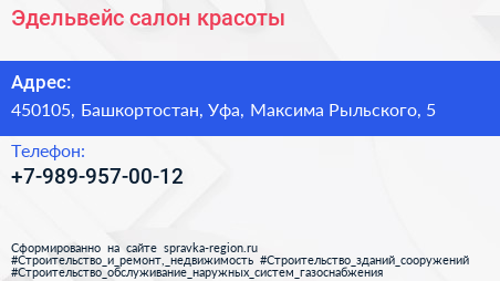 Эдельвейс, салон красоты по адресу 450105, Башкортостан, Уфа, Максима Рыльского, 5 в дальнейшем Организация, размещена в следующих категориях: