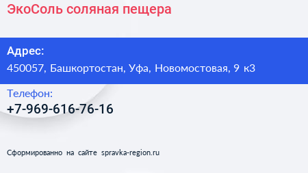 ЭкоСоль, соляная пещера по адресу 450057, Башкортостан, Уфа, Новомостовая, 9 к3 в дальнейшем Организация, размещена в следующих категориях: