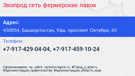 Экопрод, сеть фермерских лавок по адресу 450054, Башкортостан, Уфа, проспект Октября, 65 в дальнейшем Организация, размещена в следующих категориях: