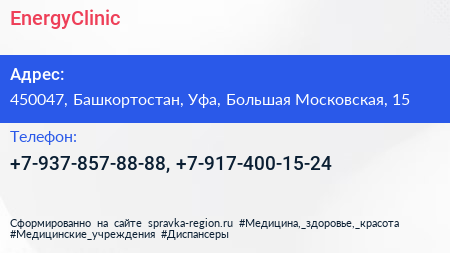 EnergyClinic по адресу 450047, Башкортостан, Уфа, Большая Московская, 15 в дальнейшем Организация, размещена в следующих категориях: