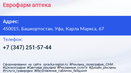Еврофарм, аптека по адресу 450015, Башкортостан, Уфа, Карла Маркса, 67 в дальнейшем Организация, размещена в следующих категориях:
