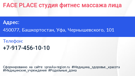 FACE PLACE, студия фитнес-массажа лица по адресу 450077, Башкортостан, Уфа, Чернышевского, 101 в дальнейшем Организация, размещена в следующих категориях: