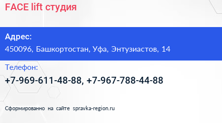 FACE lift, студия по адресу 450096, Башкортостан, Уфа, Энтузиастов, 14 в дальнейшем Организация, размещена в следующих категориях:
