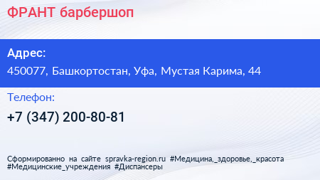 ФРАНТ, барбершоп по адресу 450077, Башкортостан, Уфа, Мустая Карима, 44 в дальнейшем Организация, размещена в следующих категориях: