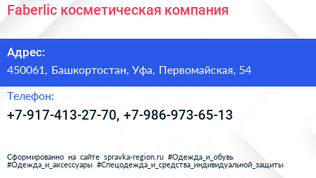 Faberlic, косметическая компания по адресу 450061, Башкортостан, Уфа, Первомайская, 54 в дальнейшем Организация, размещена в следующих категориях: