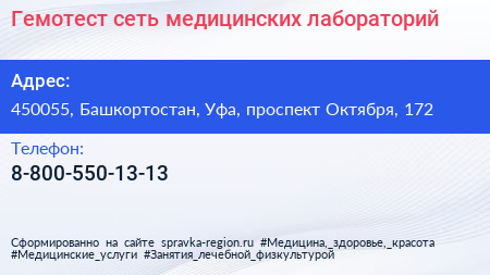 Гемотест, сеть медицинских лабораторий по адресу 450055, Башкортостан, Уфа, проспект Октября, 172 в дальнейшем Организация, размещена в следующих категориях: