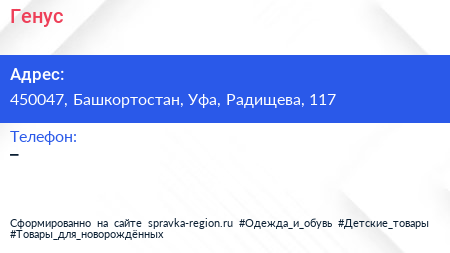 Генус по адресу 450047, Башкортостан, Уфа, Радищева, 117 в дальнейшем Организация, размещена в следующих категориях: