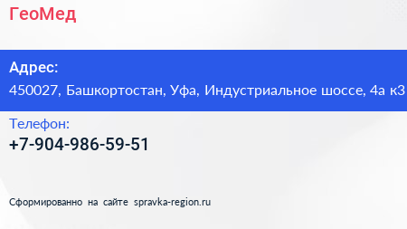 ГеоМед по адресу 450027, Башкортостан, Уфа, Индустриальное шоссе, 4а к3 в дальнейшем Организация, размещена в следующих категориях: