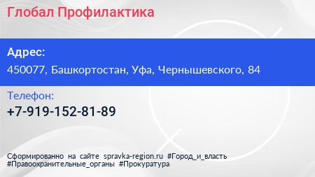 Глобал Профилактика по адресу 450077, Башкортостан, Уфа, Чернышевского, 84 в дальнейшем Организация, размещена в следующих категориях: