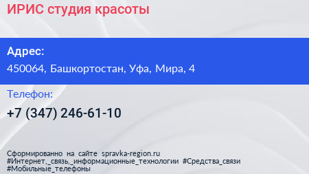 ИРИС, студия красоты по адресу 450064, Башкортостан, Уфа, Мира, 4 в дальнейшем Организация, размещена в следующих категориях: