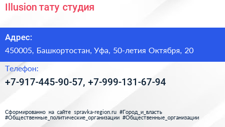 Illusion, тату-студия по адресу 450005, Башкортостан, Уфа, 50-летия Октября, 20 в дальнейшем Организация, размещена в следующих категориях: