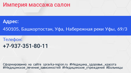 Империя массажа, салон по адресу 450105, Башкортостан, Уфа, Набережная реки Уфы, 69/3 в дальнейшем Организация, размещена в следующих категориях: