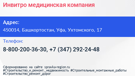 Инвитро, медицинская компания по адресу 450014, Башкортостан, Уфа, Ухтомского, 17 в дальнейшем Организация, размещена в следующих категориях: