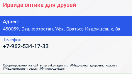Ираида-оптика для друзей по адресу 450059, Башкортостан, Уфа, Братьев Кадомцевых, 8а в дальнейшем Организация, размещена в следующих категориях: