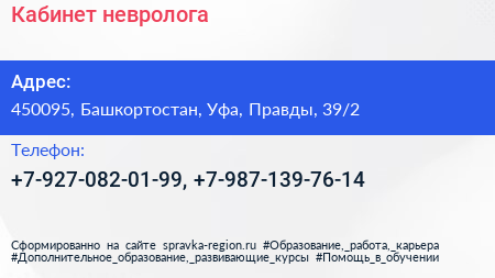 Кабинет невролога по адресу 450095, Башкортостан, Уфа, Правды, 39/2 в дальнейшем Организация, размещена в следующих категориях:
