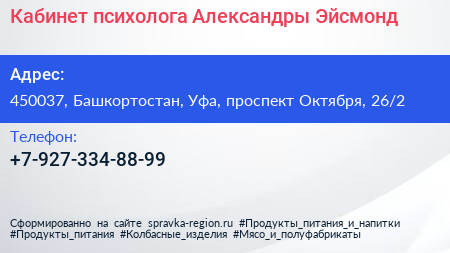 Кабинет психолога Александры Эйсмонд по адресу 450037, Башкортостан, Уфа, проспект Октября, 26/2 в дальнейшем Организация, размещена в следующих категориях:
