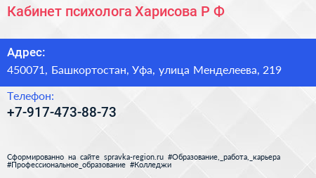 Кабинет психолога Харисова Р.Ф. по адресу 450071, Башкортостан, Уфа, улица Менделеева, 219 в дальнейшем Организация, размещена в следующих категориях: