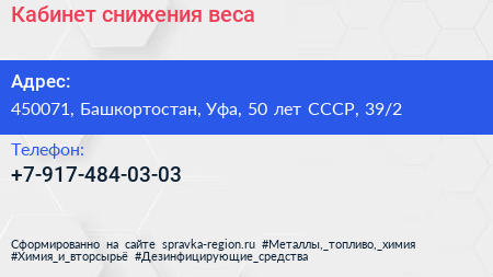 Кабинет снижения веса по адресу 450071, Башкортостан, Уфа, 50 лет СССР, 39/2 в дальнейшем Организация, размещена в следующих категориях: