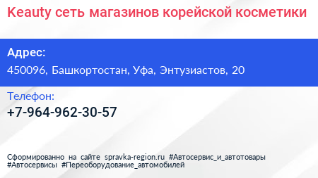 Keauty, сеть магазинов корейской косметики по адресу 450096, Башкортостан, Уфа, Энтузиастов, 20 в дальнейшем Организация, размещена в следующих категориях: