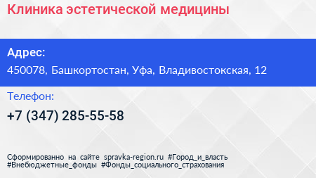 Клиника эстетической медицины по адресу 450078, Башкортостан, Уфа, Владивостокская, 12 в дальнейшем Организация, размещена в следующих категориях: