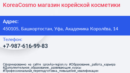 KoreaCosmo, магазин корейской косметики по адресу 450105, Башкортостан, Уфа, Академика Королёва, 14 в дальнейшем Организация, размещена в следующих категориях: