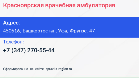 Красноярская врачебная амбулатория по адресу 450516, Башкортостан, Уфа, Фрунзе, 47 в дальнейшем Организация, размещена в следующих категориях: