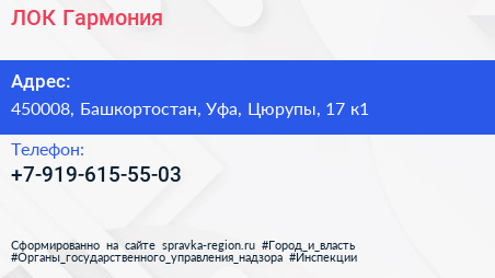 ЛОК Гармония по адресу 450008, Башкортостан, Уфа, Цюрупы, 17 к1 в дальнейшем Организация, размещена в следующих категориях: