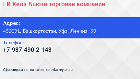 LR Хелз & Бьюти, торговая компания по адресу 450091, Башкортостан, Уфа, Ленина, 99 в дальнейшем Организация, размещена в следующих категориях: