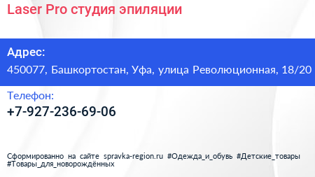 Laser Pro, студия эпиляции по адресу 450077, Башкортостан, Уфа, улица Революционная, 18/20 в дальнейшем Организация, размещена в следующих категориях: