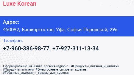 Luxe Korean по адресу 450092, Башкортостан, Уфа, Софьи Перовской, 29в в дальнейшем Организация, размещена в следующих категориях: