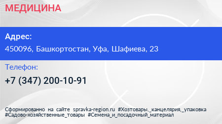 МЕДИЦИНА по адресу 450096, Башкортостан, Уфа, Шафиева, 23 в дальнейшем Организация, размещена в следующих категориях: