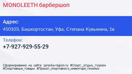 MONOLEETH, барбершоп по адресу 450103, Башкортостан, Уфа, Степана Кувыкина, 1в в дальнейшем Организация, размещена в следующих категориях:
