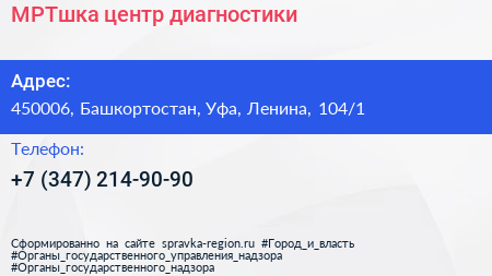 МРТшка, центр диагностики по адресу 450006, Башкортостан, Уфа, Ленина, 104/1 в дальнейшем Организация, размещена в следующих категориях: