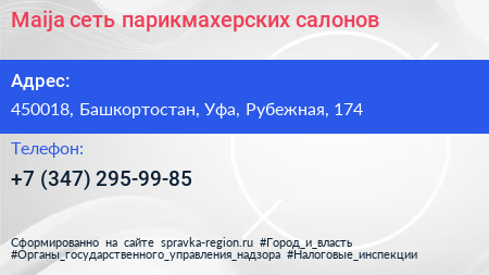 Maija, сеть парикмахерских салонов по адресу 450018, Башкортостан, Уфа, Рубежная, 174 в дальнейшем Организация, размещена в следующих категориях: