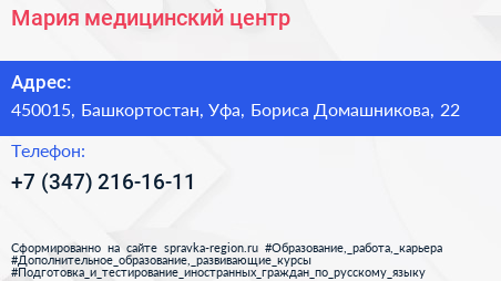 Мария, медицинский центр по адресу 450015, Башкортостан, Уфа, Бориса Домашникова, 22 в дальнейшем Организация, размещена в следующих категориях: