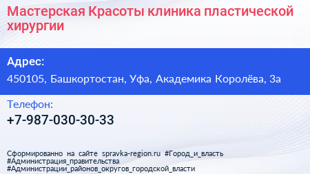 Мастерская Красоты, клиника пластической хирургии по адресу 450105, Башкортостан, Уфа, Академика Королёва, 3а в дальнейшем Организация, размещена в следующих категориях: