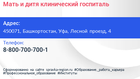 Мать и дитя, клинический госпиталь по адресу 450071, Башкортостан, Уфа, Лесной проезд, 4 в дальнейшем Организация, размещена в следующих категориях: