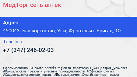 МедТорг, сеть аптек по адресу 450043, Башкортостан, Уфа, Фронтовых Бригад, 10 в дальнейшем Организация, размещена в следующих категориях: