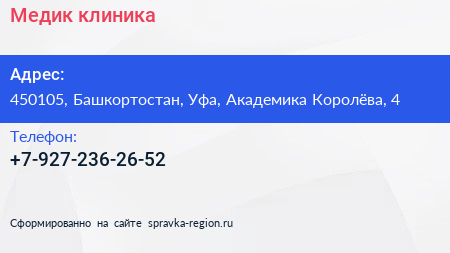 Медик, клиника по адресу 450105, Башкортостан, Уфа, Академика Королёва, 4 в дальнейшем Организация, размещена в следующих категориях: