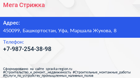 Мега Стрижка по адресу 450099, Башкортостан, Уфа, Маршала Жукова, 8 в дальнейшем Организация, размещена в следующих категориях: