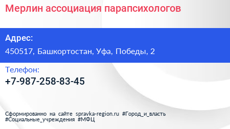 Мерлин, ассоциация парапсихологов по адресу 450517, Башкортостан, Уфа, Победы, 2 в дальнейшем Организация, размещена в следующих категориях:
