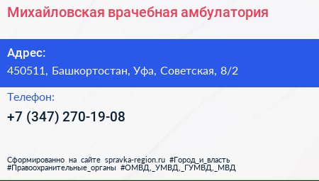 Михайловская врачебная амбулатория по адресу 450511, Башкортостан, Уфа, Советская, 8/2 в дальнейшем Организация, размещена в следующих категориях: