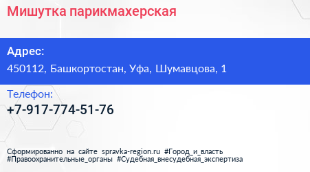 Мишутка, парикмахерская по адресу 450112, Башкортостан, Уфа, Шумавцова, 1 в дальнейшем Организация, размещена в следующих категориях: