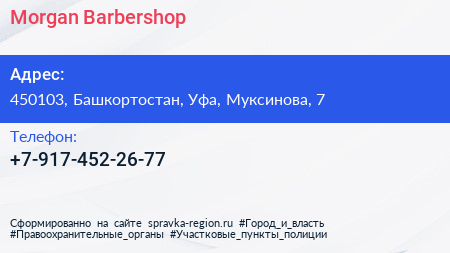 Morgan Barbershop по адресу 450103, Башкортостан, Уфа, Муксинова, 7 в дальнейшем Организация, размещена в следующих категориях: