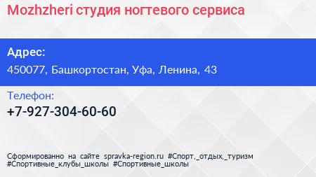 Mozhzheri, студия ногтевого сервиса по адресу 450077, Башкортостан, Уфа, Ленина, 43 в дальнейшем Организация, размещена в следующих категориях: