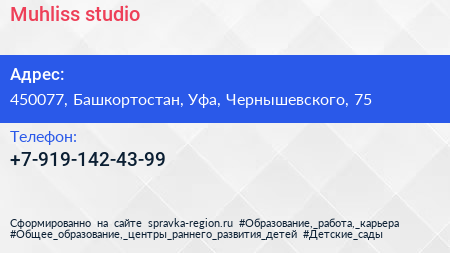 Muhliss studio по адресу 450077, Башкортостан, Уфа, Чернышевского, 75 в дальнейшем Организация, размещена в следующих категориях: