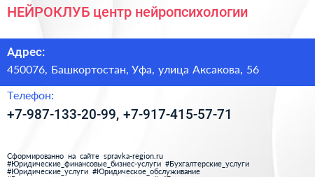 НЕЙРОКЛУБ, центр нейропсихологии по адресу 450076, Башкортостан, Уфа, улица Аксакова, 56 в дальнейшем Организация, размещена в следующих категориях: