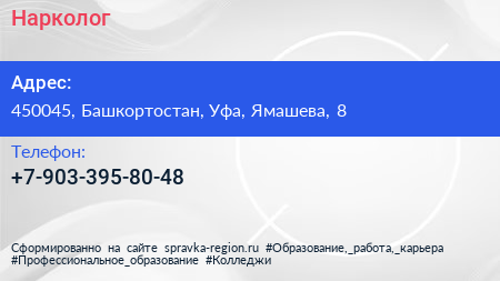 Нарколог по адресу 450045, Башкортостан, Уфа, Ямашева, 8 в дальнейшем Организация, размещена в следующих категориях: