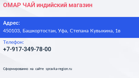 ОМАР-ЧАЙ, индийский магазин по адресу 450103, Башкортостан, Уфа, Степана Кувыкина, 1в в дальнейшем Организация, размещена в следующих категориях: