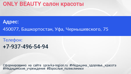 ONLY BEAUTY, салон красоты по адресу 450077, Башкортостан, Уфа, Чернышевского, 75 в дальнейшем Организация, размещена в следующих категориях: